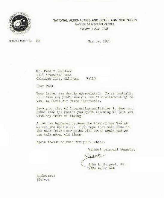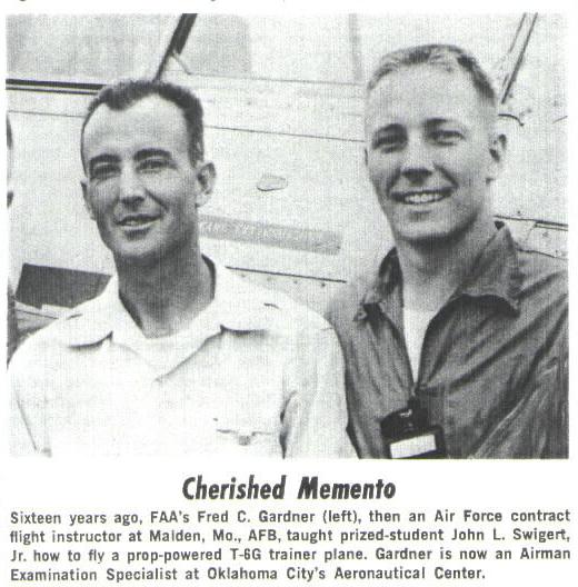 By mid-summer of 1954, Fred had been a flight instructor in the Air Force Primary Pilot Training Training Program at Malden Air Base for three years. The student pilots of Class 55-C reported for training in July. One of the four students assigned to Fred was a twenty-two year old second lieutenant named John L. (Jack) Swigert. Jr. Jack had graduated from the University of Colorado that spring with a degree in mechanical engineering. He had also earned an Air Force reserve commission through the Air Force R.O.T.C. program. In addition, he had played played end on the University of Colorado football team. During the first hours of his flight instruction, Fred recognized that Jack took to flying like a duck takes to water. Later in his career, as Fred recalled the more than one hundred student pilots he had trained during his sixteen years with the Air Force and Army Primary Pilot Training Schools, he mentally ranked them. In that ranking, he placed Jack Swigert among his top four student pilots. That ranking proved to be accurate in 1970, when Jack was selected as one of the three crewmembers of Apollo 13. The rest is history, as the whole world knows.